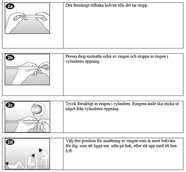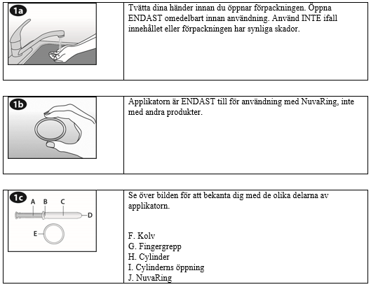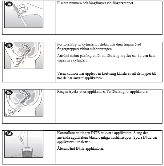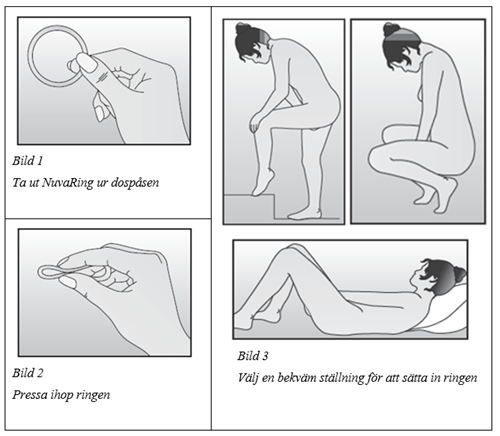 Kvinnan kan själv föra in NuvaRing i slidan. Läkaren ska informera kvinnan om hur hon ska sätta in och ta ut NuvaRing. För insättningen ska kvinnan välja den ställning som är mest bekväm för henne, t.ex. stå med ett ben upphöjt och stött, sitta på huk eller ligga ner. NuvaRing ska pressas ihop och föras in i slidan tills den inte känns (se bild 1-4). Ett valfritt alternativ är att sätta in ringen genom att använda NuvaRing Applikator som tillhandahålls separat eller är inkluderad i förpackningen. NuvaRing Applikator kommer eventuellt inte att vara tillgänglig i alla länder. Den exakta positionen av NuvaRing i slidan är inte avgörande för effekten (se bilderna 1–4).