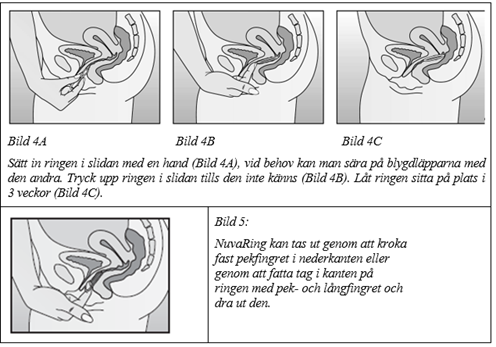 När NuvaRing har satts in (se ”Hur man börjar med NuvaRing”) ska den sitta på plats i 3 veckor. Rekommendera kvinnan att regelbundet kontrollera att NuvaRing är på plats (till exempel före och efter samlag). Om NuvaRing av misstag tas ut ska kvinnan följa instruktionerna som ges i avsnitt Dosering och administreringssätt ”Tillfällig uttagning” (för ytterligare information se även avsnitt Varningar och försiktighet ”Utstötning”). NuvaRing ska tas ut 3 veckor senare på samma veckodag som ringen sattes in. Efter den ringfria perioden på en vecka ska en ny ring sättas in (t.ex. när NuvaRing har satts in på en onsdag klockan 22 ska ringen tas ut på onsdag 3 veckor senare cirka klockan 22. Nästkommande onsdag ska en ny ring sättas in). NuvaRing kan tas ut genom att kroka fast pekfingret i nederkanten eller genom att fatta tag i kanten med pek- och långfingret och dra ut den (se bild 5). Den använda ringen ska läggas tillbaka i dospåsen (utom räckhåll för barn och husdjur) och kastas enligt anvisning i avsnitt Särskilda anvisningar för destruktion och övrig hantering. Bortfallsblödningen startar vanligtvis 2–3 dagar efter uttagningen av NuvaRing och behöver inte ha slutat innan nästa ring sätts in.