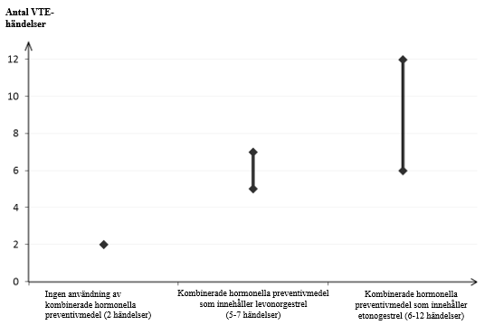 1Genomsnittsintervallet är på 5‑7 per 10 000 kvinnoår, baserat på en relativ risk för kombinerade hormonella preventivmedel som innehåller levonorgestrel jämfört med en icke användning på cirka 2,3 till 3,6.