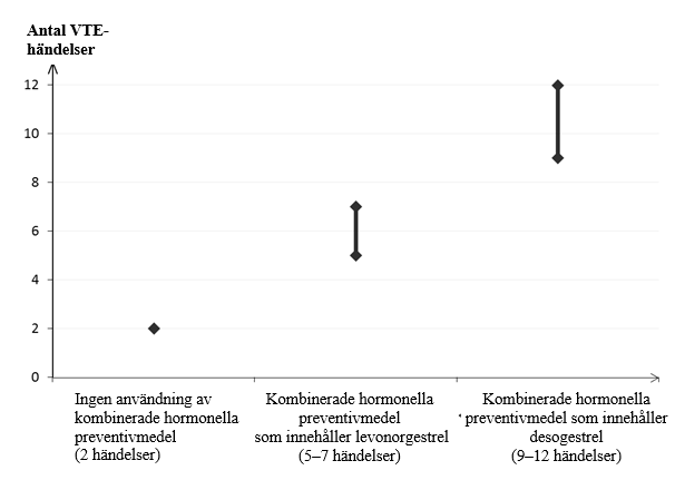 Man uppskattar1 att av 10 000 kvinnor som använder kombinerade hormonella preventivmedel innehållande desogestrel kommer mellan 9 och 12 kvinnor att utveckla en VTE under ett år; detta kan jämföras med cirka 62 kvinnor som använder kombinerade hormonella preventivmedel som innehåller levonorgestrel.