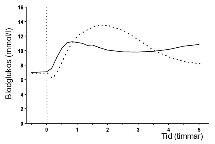 Fig. I. Blodglukoskoncentrationer efter en singeldos NovoRapid injicerad omedelbart före en måltid (den heldragna kurvan) eller lösligt humant insulin administrerat 30 minuter före en måltid (den prickade kurvan) hos patienter med typ 1-diabetes mellitus.