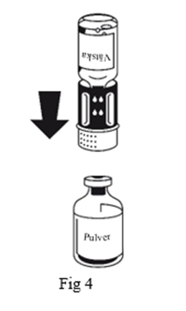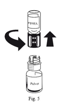 4. Placera injektionsflaskan med pulvret på en plan yta och håll den stadigt. Ta injektionsflaskan med spädningsvätska med det anslutna överföringssetet och vänd den upp och ned. Sätt den vita delen på pulverflaskans propp och tryck bestämt tills det klickar (Fig.4). Vrid inte medan du ansluter.