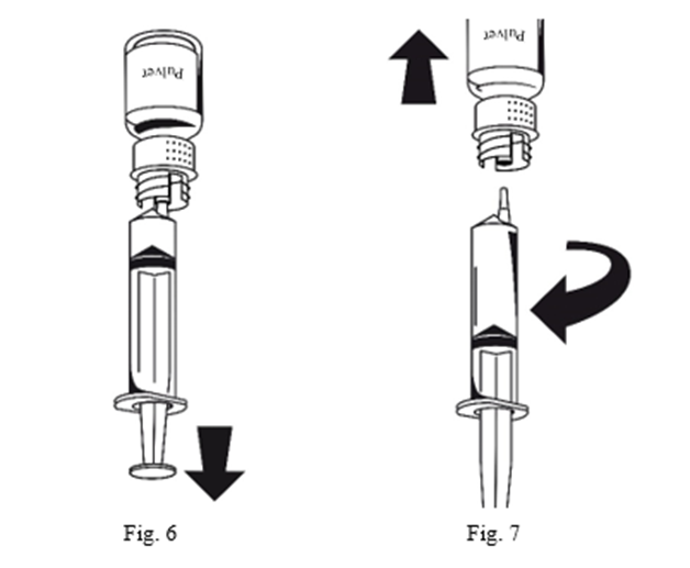 När lösningen har överförts, håll stadigt i sprutans kolv (med kolven nedåt) och avlägsna sprutan från överföringssetet (Fig.7).