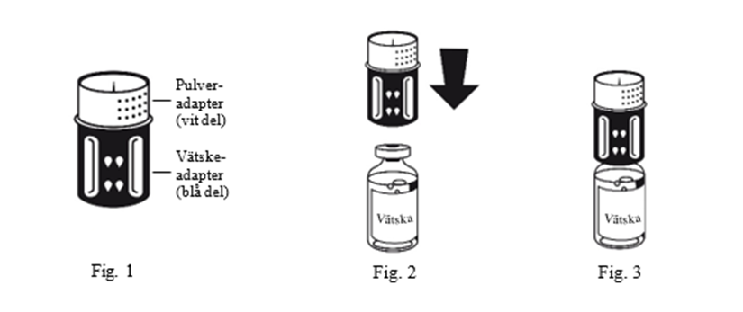 3. Överföringssetet avbildas i Fig 1. Placera injektionsflaskan med spädningsvätska på en plan yta och håll den stadigt. Ta överföringssetet och vänd den upp och ned. Sätt den blå delen av överföringssetet på flaskan med spädningsvätska och tryck bestämt tills det klickar (Fig 2+3). Vrid inte medan du ansluter.