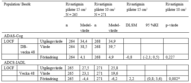 ADCS-IADL scores: En positiv skillnad i DLSM indikerar större förbättring med rivastigmin 15 cm2 jämfört med rivastigmin 10 cm2.