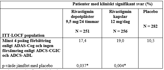 Resultaten för de patienter som svarat kliniskt relevant på behandlingen i den placebokontrollerade 24-veckorsstudien framgår av tabell 3. Kliniskt relevant förbättring definierades på förhand som minst 4 punkters förbättring enligt ADAS-Cog, ingen försämring enligt ADCS-CGIC och ingen försämring enligt ADCS-ADL.