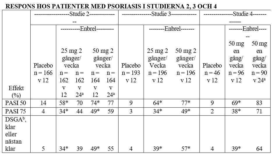 I studie 4 hade den grupp som behandlades med Enbrel en högre andel patienter med PASI 75 vid 12 veckor (38 %) jämfört med den grupp som fått placebo (2 %) (p< 0,0001). För de patienter som fick 50 mg en gång per vecka genom hela studien fortsatte effekten att öka så att 71 % uppnådde PASI 75 vid 24 veckor.