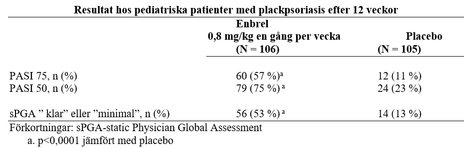 Patienterna behandlades med Enbrel 0,8 mg/kg (upp till 50 mg) eller placebo en gång per vecka i 12 veckor. Vid vecka 12 hade en större andel av de patienter som randomiserats till Enbrel en positiv effekt, i form av uppnådd PASI 75, än de som randomiserats till att få placebo.