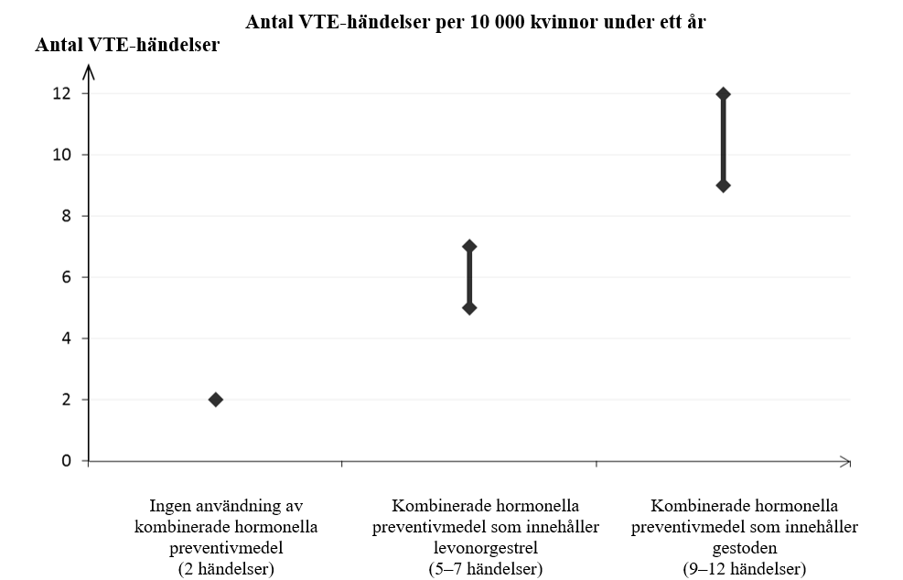 Man uppskattar1 att av 10 000 kvinnor som använder kombinerade hormonella preventivmedel innehållande gestoden kommer mellan 9 och 12 kvinnor att utveckla en VTE under ett år; detta kan jämföras med cirka 62 kvinnor som använder kombinerade hormonella preventivmedel som innehåller levonorgestrel.