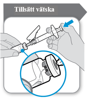 Tillsätt spädningsvätskan till injektionsflaskan med pulver. Spädningsvätskan ska långsamt tömmas i injektionsflaskan för att undvika risken för skumbildning. Det skulle göra läkemedlet oanvändbart. Lös pulvret i vattnet genom långsam rotation av flaskan. Flaskan ska inte skakas, eftersom detta kan göra att den aktiva substansen denatureras.