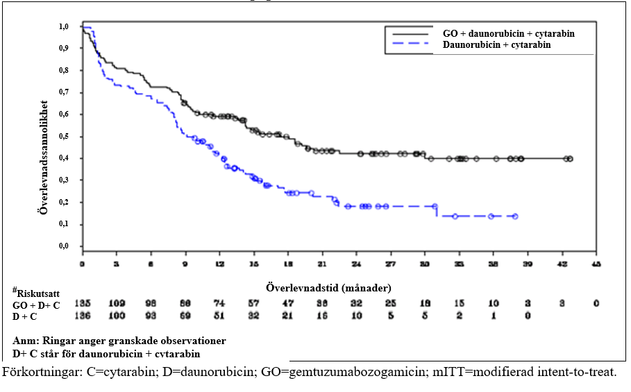 Effekten av MYLOTARG har uppvisats hos AML-patienter med en cytogenetik som medför gynnsam och intermediär risk, medan det finns en osäkerhet rörande omfattningen av effekten hos patienter med högriskcytogenetik (se avsnitt Farmakodynamiska egenskaper). För patienter som behandlas med MYLOTARG i kombination med daunorubicin och cytarabin för nydiagnosticerad de novo AML, ska man när cytogenetiktestresultaten har kommit överväga om de potentiella fördelarna med att fortsätta behandlingen med MYLOTARG är större än riskerna för den enskilda patienten (se avsnitt Farmakodynamiska egenskaper).