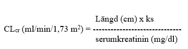 CLcr ml/min/1,73 m2 kan värderas genom bestämning av serumkreatinin (mg/dl), för yngre ungdomar, barn och spädbarn, genom att använda följande formel (Schwartz formel):