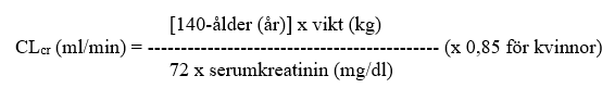 För vuxna patienter, se tabellen nedan och justera dosen enligt denna. För att använda denna doseringstabell måste patientens kreatininclearance (CLcr) ml/min uppskattas. CLcr ml/min kan värderas genom bestämning av serumkreatinin (mg/dl), för vuxna och ungdomar som väger 50 kg eller mer, genom att använda följande formel: