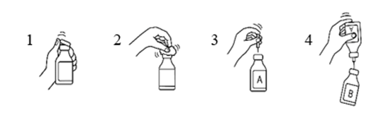 För att påskynda upplösningen kan man snurra flaskan försiktigt och, om det är nödvändigt, värma den till 30 °C. Flaskan får inte skakas och temperaturen får inte överstiga 37 °C. Om flaskan värms i vattenbad, ska försiktighet iakttas så att vattnet inte kommer i kontakt med det skyddande locket och/eller gummiproppen.