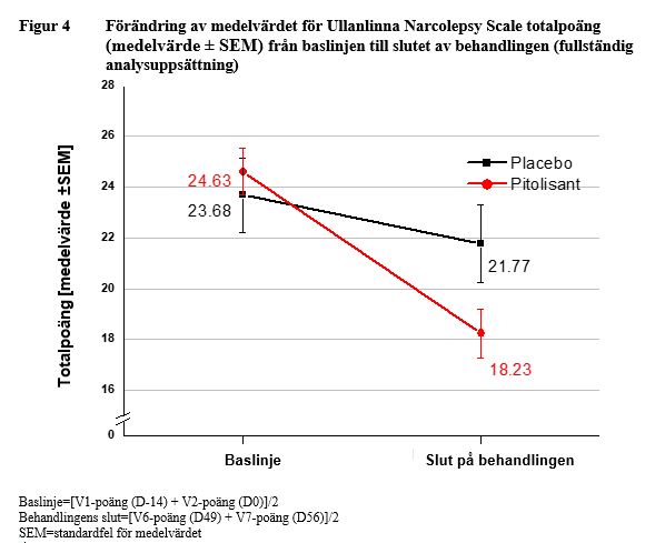 Hos patienter med mild nedsatt leverfunktion (Child-Pugh A) fanns det inga signifikanta förändringar av farmakokinetiken jämfört med normala friska frivilliga försökspersoner. Hos patienter med måttligt nedsatt leverfunktion (Child-Pugh B) ökade AUC med faktor 2,4 samtidigt som halveringstiden fördubblades (se avsnitt Dosering och administreringssätt) Farmakokinetiken för pitolisant efter upprepad administrering till patienter med nedsatt leverfunktion har ännu inte utvärderats.