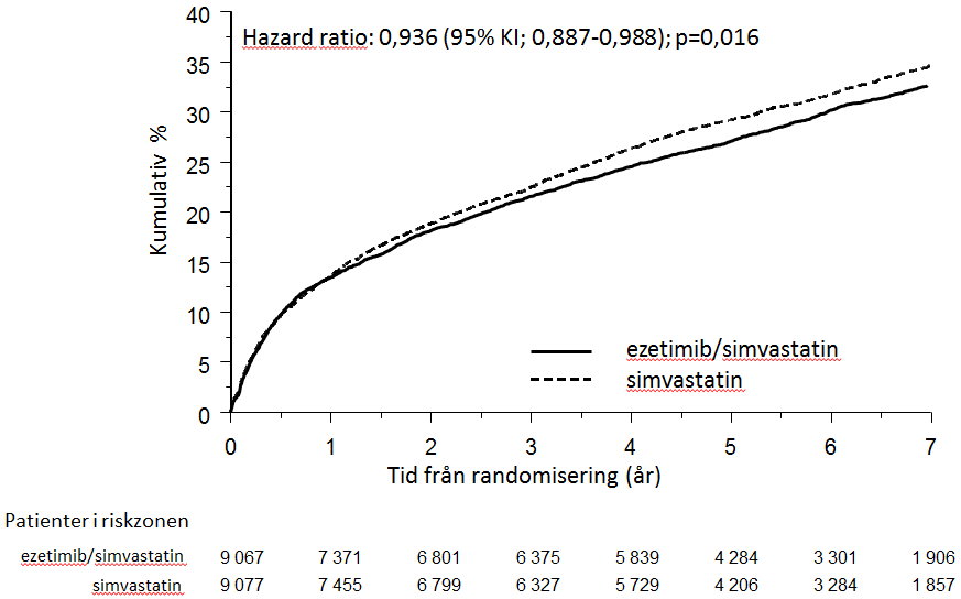 Den primära effektmåttsanalysen visade att ezetimib kombinerat med simvastatin signifikant minskade risken för allvarliga vaskulära händelser (749 patienter med händelser i placebogruppen jämfört med 639 i ezetimib kombinerat med simvastatingruppen) med en relativ riskminskning på 16% (p=0,001).