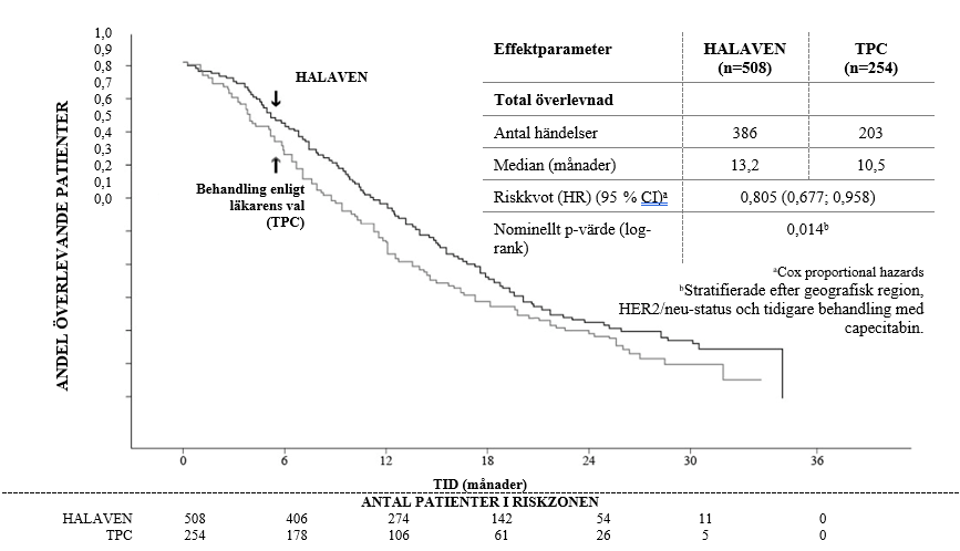 HALAVEN är indicerat för behandling av vuxna patienter med lokalt framskriden eller metastaserande bröstcancer som har progredierat efter åtminstone en kemoterapiregim för avancerad sjukdom (se avsnitt Farmakodynamiska egenskaper). Tidigare behandling ska ha inkluderat ett antracyklin- och ett taxanpreparat, antingen adjuvant eller vid metastatisk sjukdom, utom i de fall då patienten inte var lämplig för dessa behandlingar.
