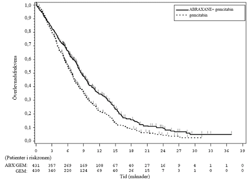 Abraxane i kombination med gemcitabin är indicerat för första linjens behandling av vuxna patienter med metastaserande adenocarcinom i pankreas.