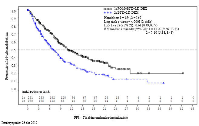 Behandling med pomalidomid kombinerat med bortezomib och dexametason bör ges tills sjukdomen progredierar eller tills oacceptabel toxicitet uppstår.