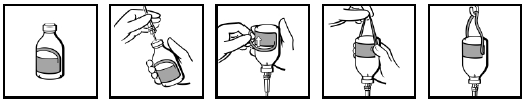 Injektionsflaskorna levereras med en hängetikett (fig. 1). Efter isättning av infusionssetet (fig. 2), vänd injektionsflaskan upp och ned och etikettens ögla viks bakåt (fig. 3). Tryck hårt med fingrarna för att skapa ett veck på vardera sidan av öglan där den sitter ihop med resten av etiketten (fig. 4). Häng upp injektionsflaskan på infusionsstativet i den ögla som bildats (fig. 5).