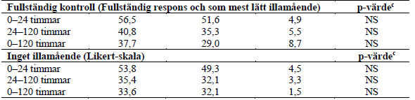 Tabell 3: Procentandel patientera som svarade på behandling, uppdelade efter behandlingsgrupp och fas i studien av högemetogen kemoterapi versus ondansetron