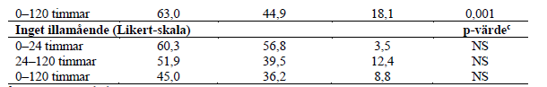 Tabell 1: Procentandel patientera som svarade på behandling, uppdelade efter behandlingsgrupp och fas i studien av måttligt emetogen kemoterapi versus ondansetron