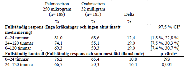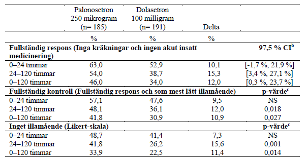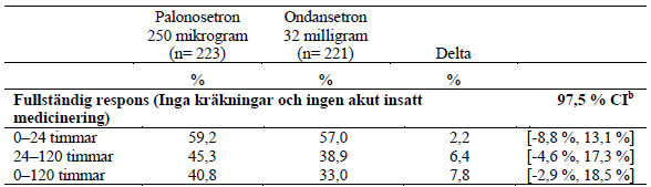 b Studien var utformad för att visa non-inferiority. En undre gräns större än –15 % visar non-inferiority mellan Palonosetron och jämförelsepreparatet.