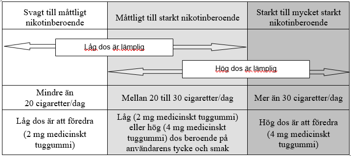 Dosen ska väljas med utgångspunkt från nikotinberoendet. 4 mg medicinskt tuggummi är avsett för rökare med starkt nikotinberoende och för rökare som tidigare misslyckats sluta röka med 2 mg medicinskt tuggummi. I övriga fall ska 2 mg tuggummi användas.