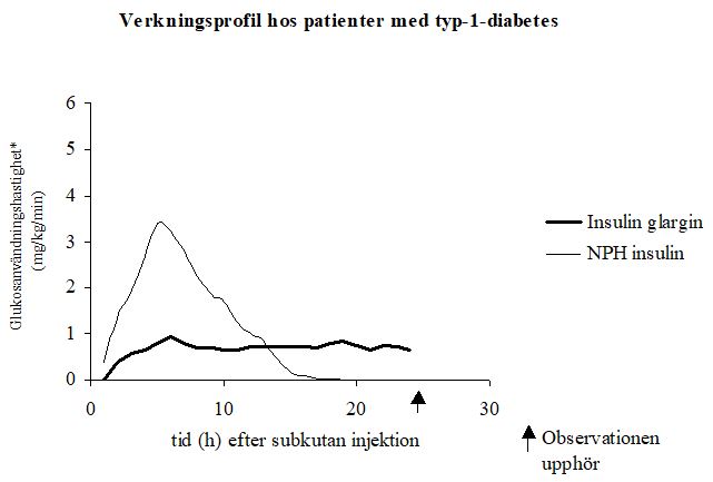 I euglykemiska clampundersökningar hos friska individer eller hos patienter med diabetes typ 1 satte effekten in långsammare för subkutant insulin glargin än för humant NPH-insulin, dess verkningsprofil var jämn och utan toppar, och effektdurationen förlängdes.