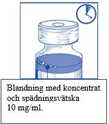 Inspektera injektionsflaskan med koncentrat och den medföljande spädningsvätskan. Lösningen med koncentrat och spädningsvätskan ska vara klar.