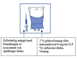 Injicera lösningen i en steril PVC-fri behållare med antingen 5 % glukoslösning eller natriumklorid 9 mg/ml (0,9 %) infusionsvätska, lösning. Koncentrationen av infusionslösningen ska vara mellan 0,10 mg/ml och 0,26 mg/ml