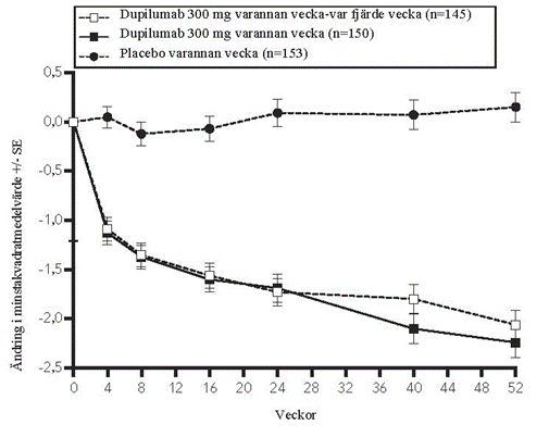 Den rekommenderade dosen av dupilumab för vuxna är en initial dos på 300 mg, följt av 300 mg varannan vecka.