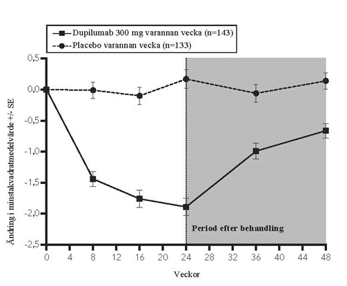 Man bör överväga att avbryta behandlingen hos patienter där ingen effekt uppvisats efter 16 veckors behandling för atopisk dermatit. Vissa patienter med initial partiell effekt kan senare uppnå förbättring med fortsatt behandling efter längre än 16 veckor. Om behandling med dupilumab måste avbrytas, kan återinsättande av behandlingen fortfarande vara framgångsrik.