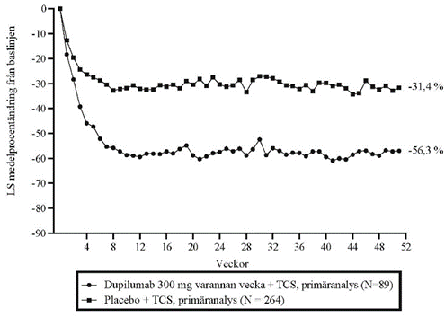 Totalt 35 ungdomar i åldern 12 till 17 år med eosinofil esofagit och med en kroppsvikt på ≥ 40 kg inkluderades i TREET del A och B och fick 300 mg varje vecka. Den genomsnittliga steady-state-dalkoncentrationen av dupilumab var 227 (SD 95,3 µg/ml).