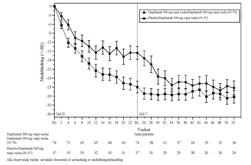 Patienter som får samtidiga orala kortikosteroider kan minska sin steroiddos när klinisk förbättring med dupilumab har inträffat (se avsnitt Farmakodynamiska egenskaper). Minskningen av steroiddosen bör ske gradvis (se avsnitt Varningar och försiktighet).