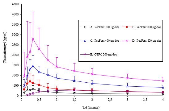 Figur 3: Genomsnittliga fentanylkoncentrationer i plasma efter enkeldoser av PecFent och OTFC hos friska försökspersoner
