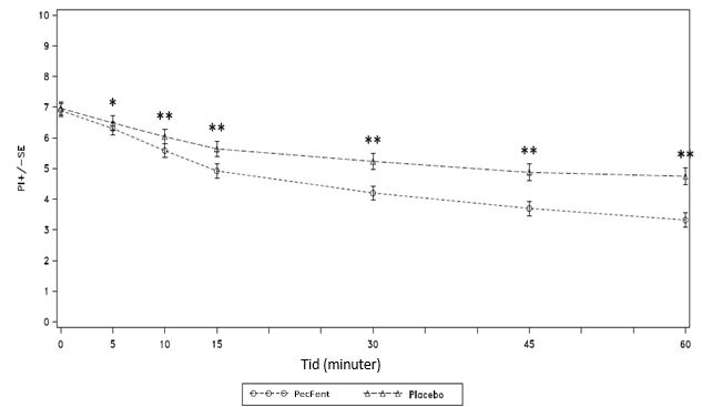 Genomsnittliga smärtintensitetsvärden (73 patienter) för samtliga PecFent-behandlade episoder (459 episoder) jämfört med episoder som behandlades med placebo (200 episoder) var signifikant lägre vid 5, 10, 15, 30, 45 och 60 minuter efter administrering (se figur 1).
