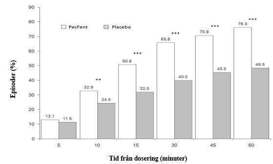 Den överlägsna effekten av PecFent jämfört med placebo stöddes av data från sekundära endpoints inklusive antalet episoder med genombrottssmärta med kliniskt betydelsefull smärtlindring, definierad som en minskning av smärtintensitetsvärdet på minst 2 (Figur 2)