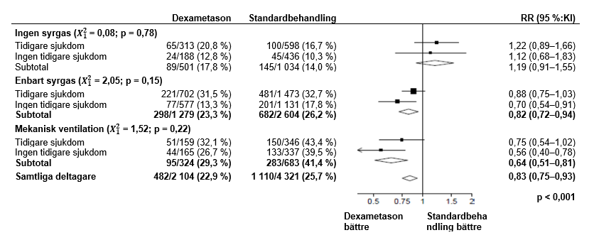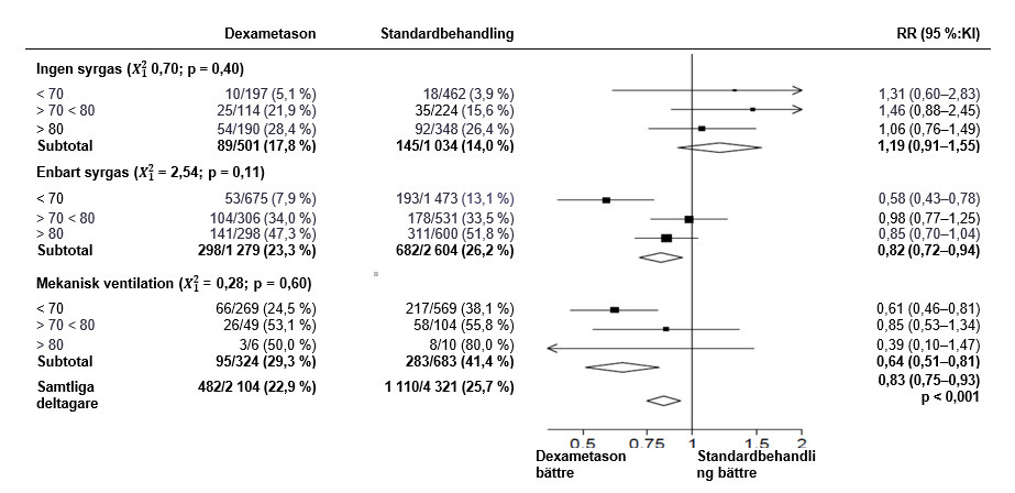 I dexametasongruppen var incidensen av dödsfall lägre än hos gruppen som fick standardbehandling för de patienter i dexametasongruppen som fick invasiv mekanisk ventilation (29,3 % vs. 41,4 %; frekvenskvot, 0,64; 95 % KI, 0,51–0,81) samt hos de som fick syrgasbehandling utan invasiv mekanisk ventilation) (23,3 % vs. 26,2 %; frekvenskvot, 0,82; 95 % KI, 0,72–0,94).