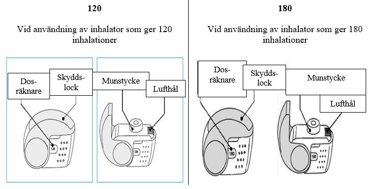 120 Vid användning av inhalator som ger 120 inhalationer | 180 Vid användning av inhalator som ger 180 inhalationer |