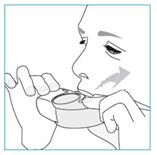 - Håll upp inhalatorn och för den till munnen, slut läpparna om munstycket.