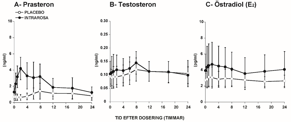 Figur 1: Serumkoncentrationer för prasteron (A), testosteron (B) och östradiol (C) uppmätt under 24 timmar dag 7 efter daglig administrering av placebo eller Intrarosa (medelvärde ± SD)