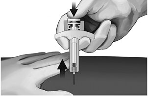 • Dra försiktigt ut nålen ur huden. Det rekommenderas att kolvstången hålls fullständigt nedtryckt medan nålen försiktigt lyfts rakt ut från injektionsstället (se bild 7).
