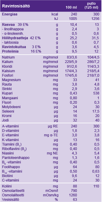 sairauteen liittyvän vajaaravitsemuksen ravitsemushoitoon. Sopii käytettäväksi lisäravinnoksi syöpäpotilaille, toipilaille, ikääntyneille, anorektikoille ja vajaaravitsemustilasta kärsiville. Sopii myös nesterajoitteisille tiiviin koostumuksensa ja pienen annoskoon ansiosta. Ei sovellu alle 3-vuotiaille. Käytetään varoen 3–6 -vuotiaille.