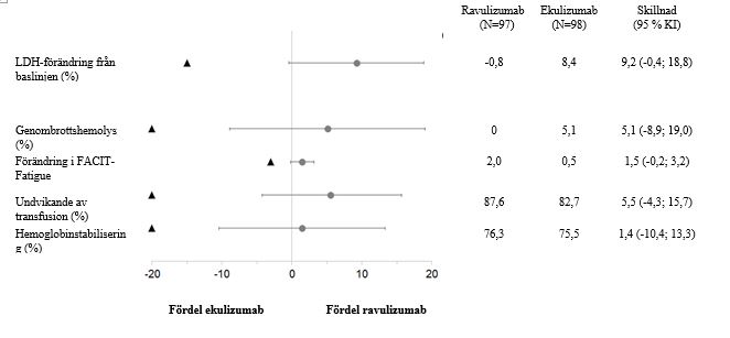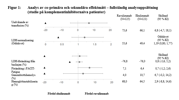 Plasmabyte (PE), plasmaferes (PP) och intravenöst immunglobulin (IVIg) har visat sig minska ravulizumabnivåerna i serum. En kompletterande dos av ravulizumab krävs vid PE, PP eller IVIg (tabell 4).