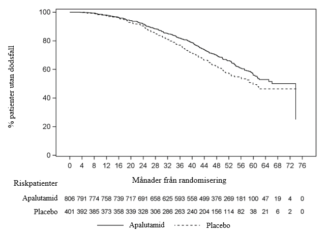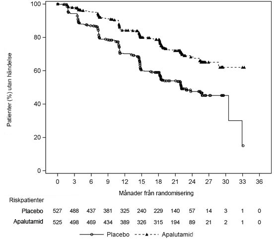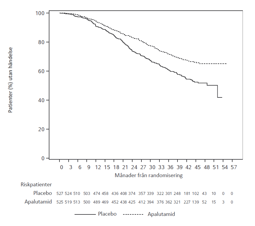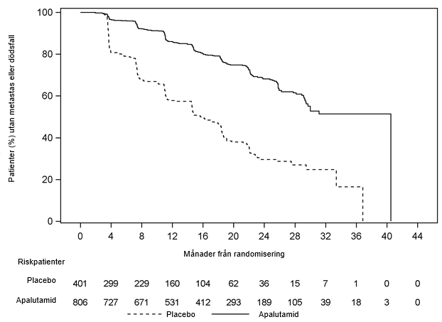 Totalt 1 207 patienter med nmCRPC randomiserades 2:1 till att få antingen apalutamid oralt i en dos på 240 mg en gång per dag i kombination med androgen deprivationsterapi (ADT) (medicinsk kastration eller tidigare kirurgisk kastrering) eller placebo med ADT i en dubbelblind, klinisk multicenterstudie (studie ARN‑509‑003). Patienter som inkluderades hade en dubbleringstid för prostataspecifikt antigen (PSA) (PSADT) ≤ 10 månader och de bedömdes löpa hög risk för nära förestående metastaserad sjukdom och prostatacancerspecifik död. Alla patienter som inte var kirurgiskt kastrerade fick ADT fortlöpande under hela studien. PSA-resultaten blindades och användes inte för utsättning av behandlingen. Patienter som randomiserades till endera gruppen fick fortsätta behandlingen fram till sjukdomsprogression definierat som blindad oberoende central granskning (BICR), påbörjad ny behandling, oacceptabel toxicitet eller tillbakadraget samtycke.