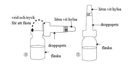 - Ta ur droppspetsen ur paketet utan att vidröra den ände som ska fästas på flaskan och fäst droppspetsen (bild 4) vid flaskan och ta inte bort den.