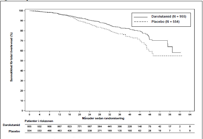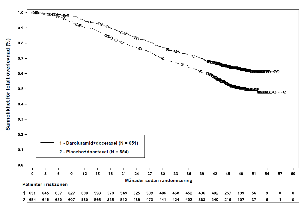 OS-frekvens vid 48 månader var 62,7 % (95 % KI, 58,7 % till 66,7 %) i darolutamid+docetaxelarmen jämfört med 50,4 % (95 % KI, 46,3 % till 54,6 %) i placebo+docetaxelarmen.