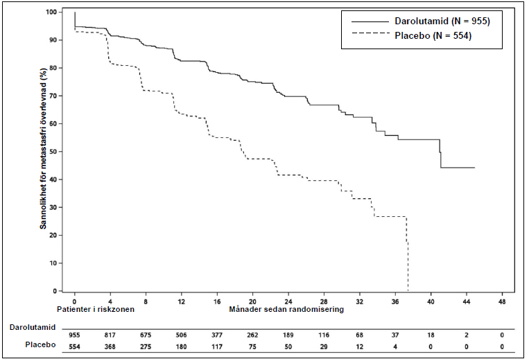 Effekt och säkerhet för darolutamid i kombination med docetaxel bedömdes i en dubbelblind, placebokontrollerad multicenterstudie i fas III (ARASENS) på patienter med mHSPC. Totalt 1 306 patienter randomiserades 1:1 till att få 600 mg darolutamid oralt två gånger dagligen (n=651) eller motsvarande placebo (n=655), samtidigt med 75 mg/m2 docetaxel under 6 cykler. Behandling med darolutamid eller placebo fortsatte till symtomatisk progressiv sjukdom, inledning av ny antineoplastisk terapi, oacceptabel toxicitet, dödsfall eller avbrutet deltagande.