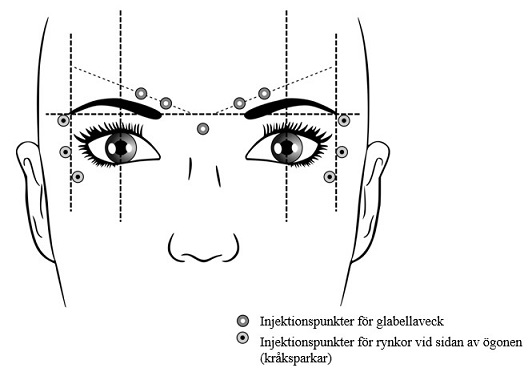Rekommenderade injektionspunkter för glabellaveck och för rynkor vid sidan av ögonen (kråksparkar) visas nedan:
